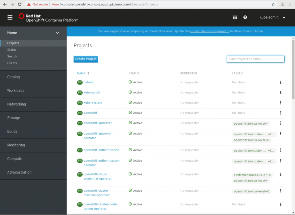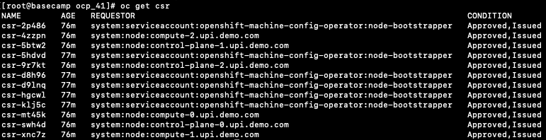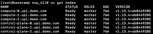 [root@basecamp ocp_41]# ./openshift-install --dir=/tmp/ocp_41/install-dir wait-for install-complete INFO Waiting up to 30m0s for the cluster at https://api.upi.demo.com:6443 to initialize... INFO Waiting up to 10m0s for the openshift-console route to be created... INFO Install complete! INFO To access the cluster as the system:admin user when using 'oc', run 'export KUBECONFIG=/tmp/ocp_41/install-dir/auth/kubeconfig' INFO Access the OpenShift web-console here: https://console-openshift-console.apps.upi.demo.com INFO Login to the console with user: kubeadmin, password: XXXXX-XXXXX-XXXXX-XXXXX